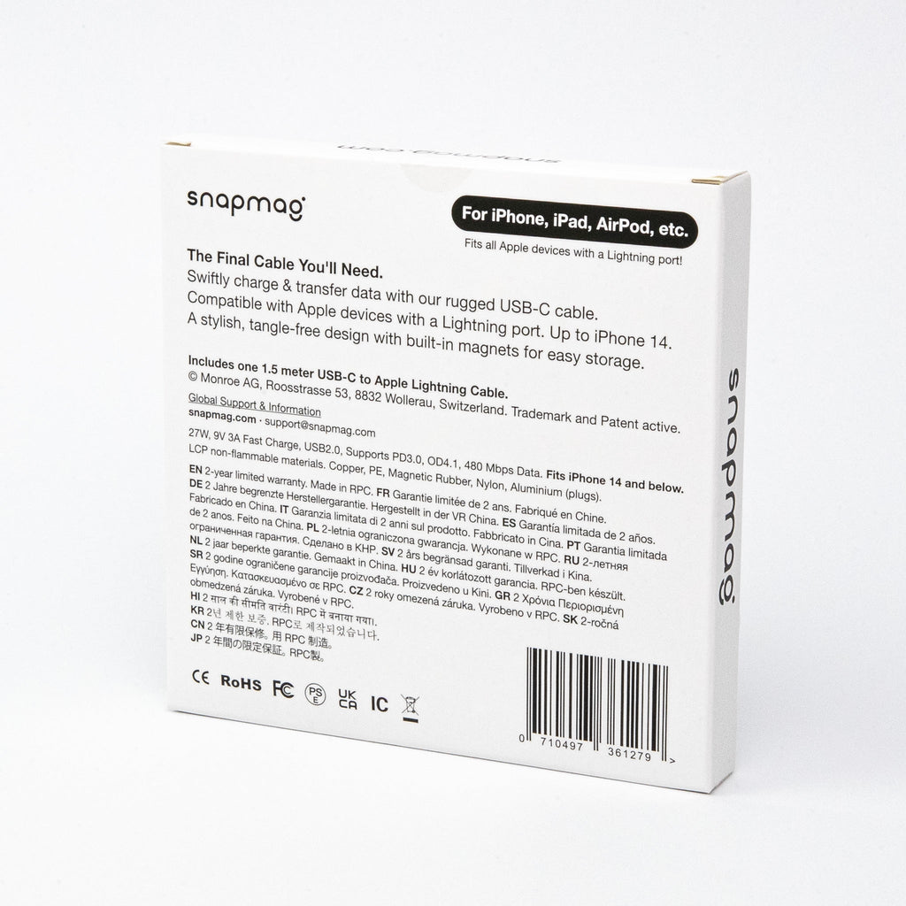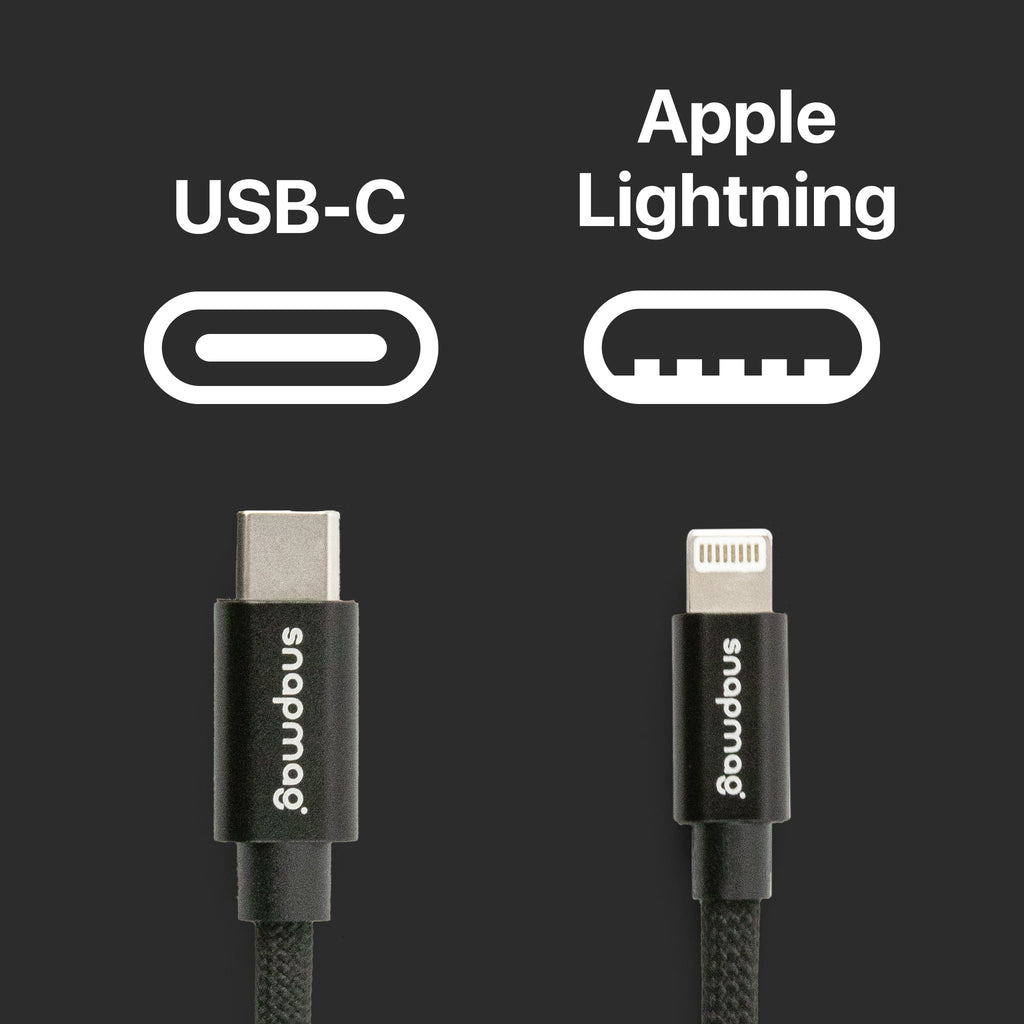 Lernen Sie die BLACK EDITION von snapmag kennen: USB-C-zu-Apple-Lightning-Kabel mit bis zu 27 W Schnellladetechnologie und einem komplett schwarzen Design mit einem schlanken, robusten Aluminiumstecker. Dank unserer revolutionären integrierten magnetischen Technologie lassen sich die snapmag-Kabel leicht aufrollen und bleiben ordentlich verstaut, ohne sich zu verheddern. Rollen Sie sie auf jede gewünschte Größe auf, um sie innovativ und praktisch zu nutzen - ideal für Reisen, unterwegs oder im Alltag.