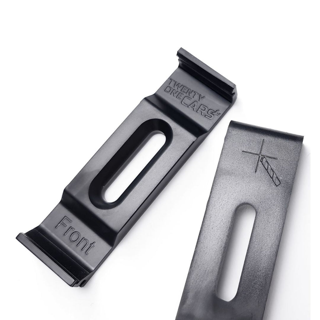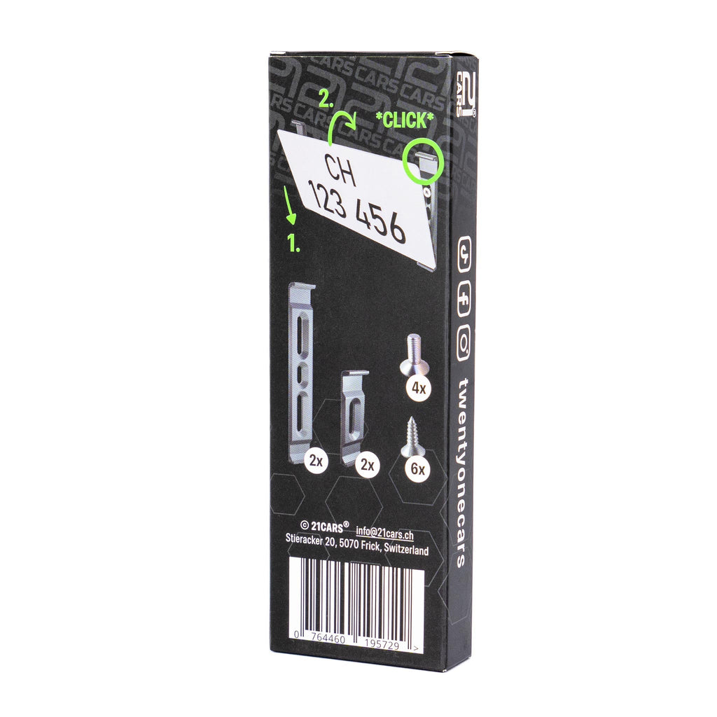 Die geniale Einfachheit der 21Cars® Kennzeichenhalter ermöglicht ein ästhetisches Erscheinungsbild sowie komfortablen und schnellen Wechsel der Kennzeichen respektive Nummernschilder von einem Fahrzeug zum anderen. Das Set ist Plug and Play. Es sind keine zusätzlichen Bohrungen am Fahrzeug notwendig. Passende Schrauben sind im Lieferumfang enthalten.